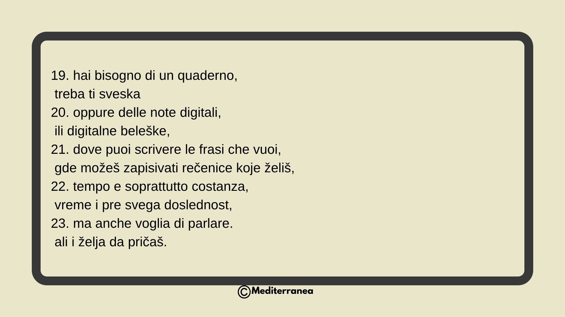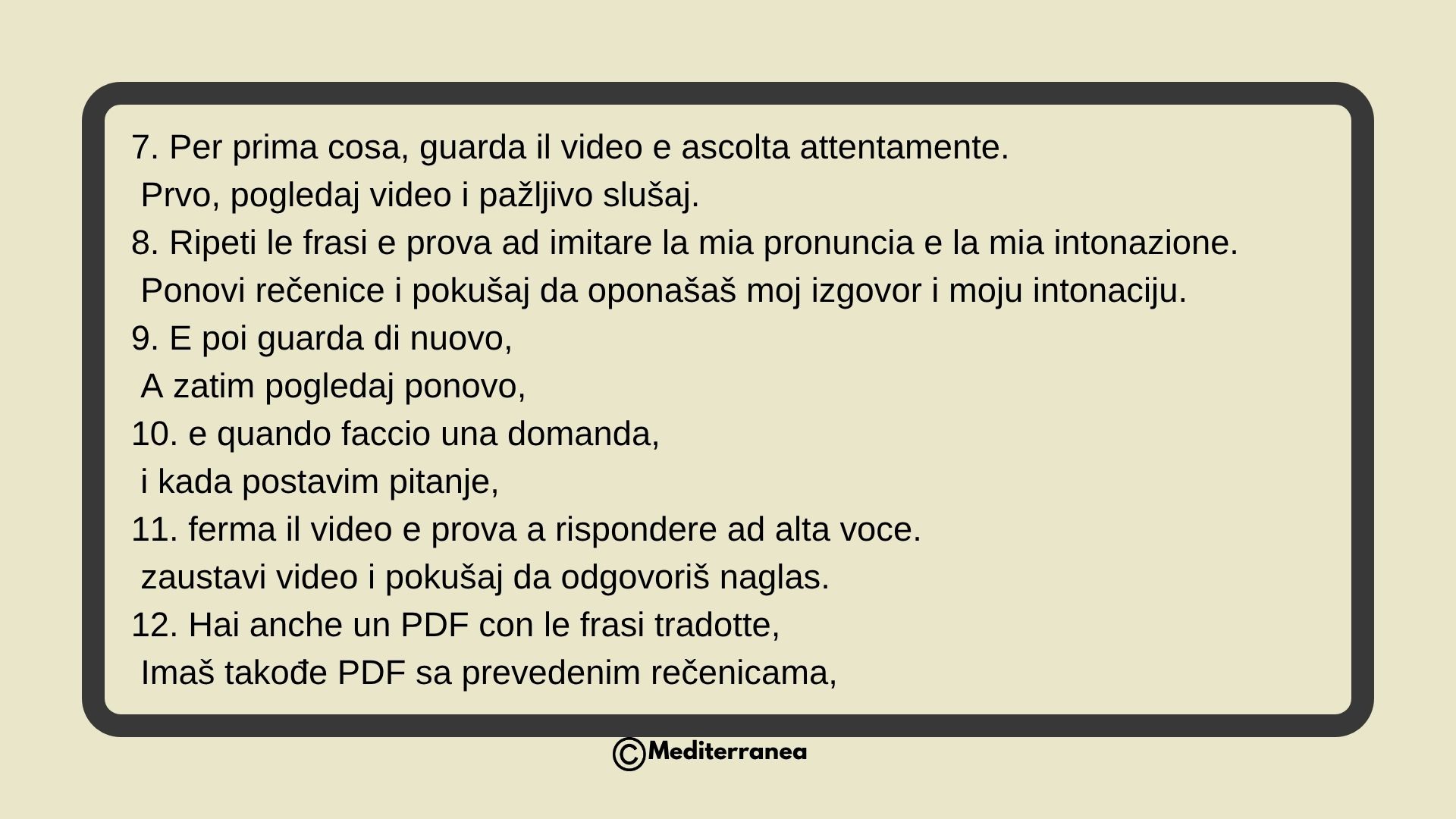 Učenje jezika je kao trening – potrebna je redovnost. „Parla con me“ ti omogućava da treniraš svoj sluh bilo gde. Svaki video je dovoljno kratak da ga pogledaš uz pauzu za kafu, a dovoljno sadržajan da te svaki put nauči nečemu novom.