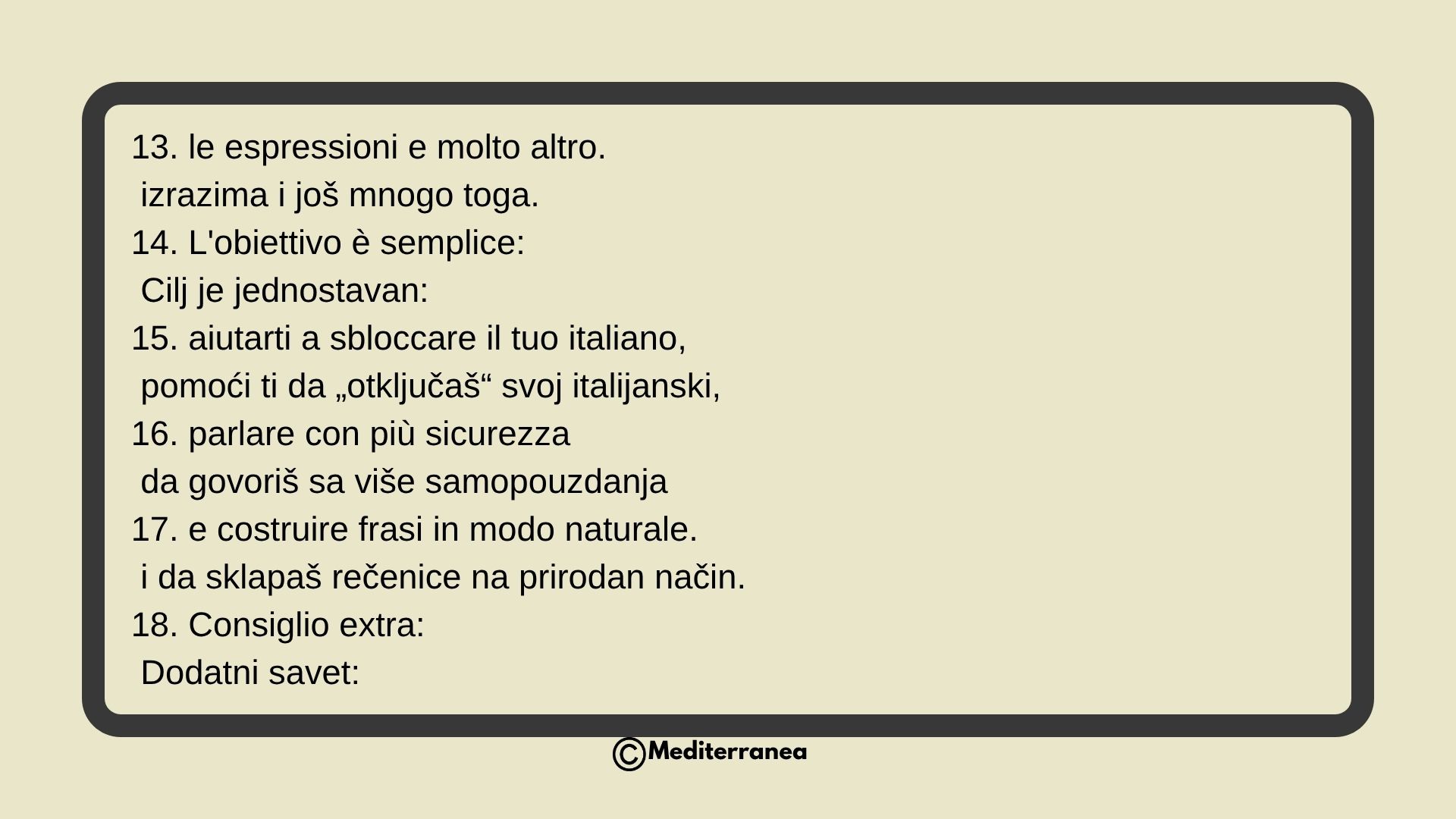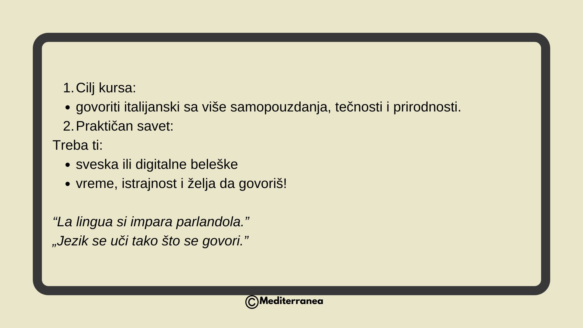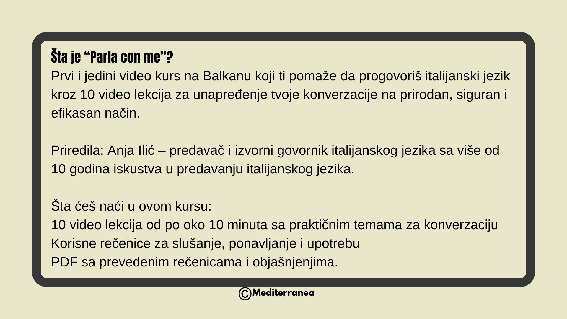 Znaš gramatiku, razumeš šta čitaš, ali kada treba da progovoriš – javi se blokada? Kurs „Parla con me“ je kreiran upravo za tebe. Ovo nije klasičan kurs sa tablom i kredom; ovo je tvoj svakodnevni trening slušanja i govora koji će ti pomoći da italijanski progovoriš prirodno, staloženo i sa samopouzdanjem.