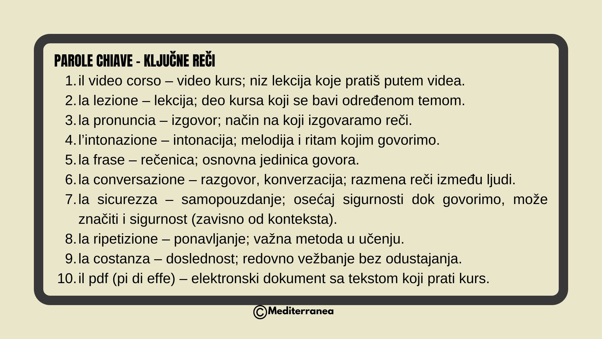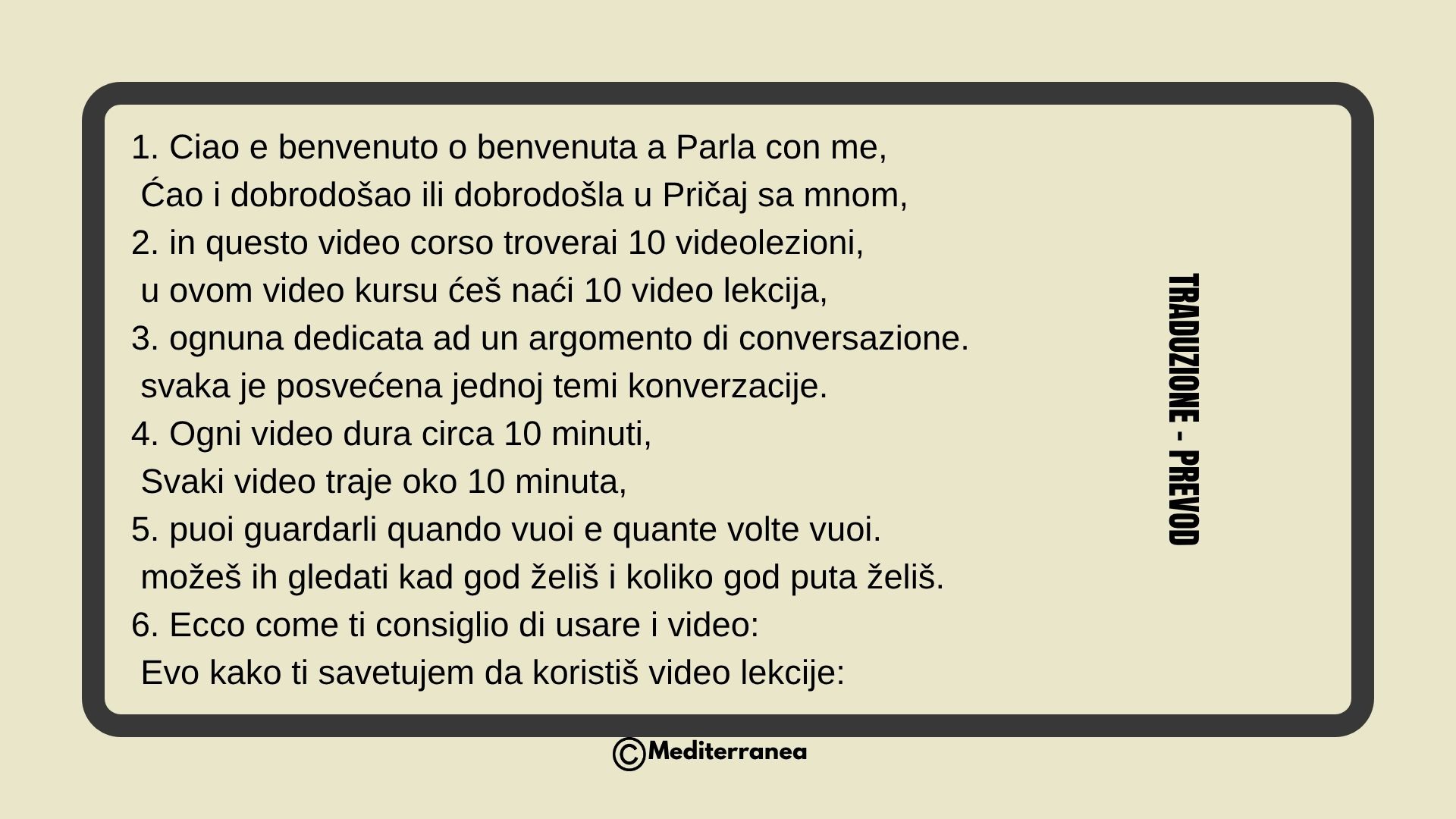 Ovaj kurs se sastoji od 10 tematskih video lekcija koje su u potpunosti na italijanskom jeziku. Da, dobro si pročitao/la – od prvog do poslednjeg minuta slušaš autentičan italijanski izgovor, ali prilagođen tvojim potrebama.