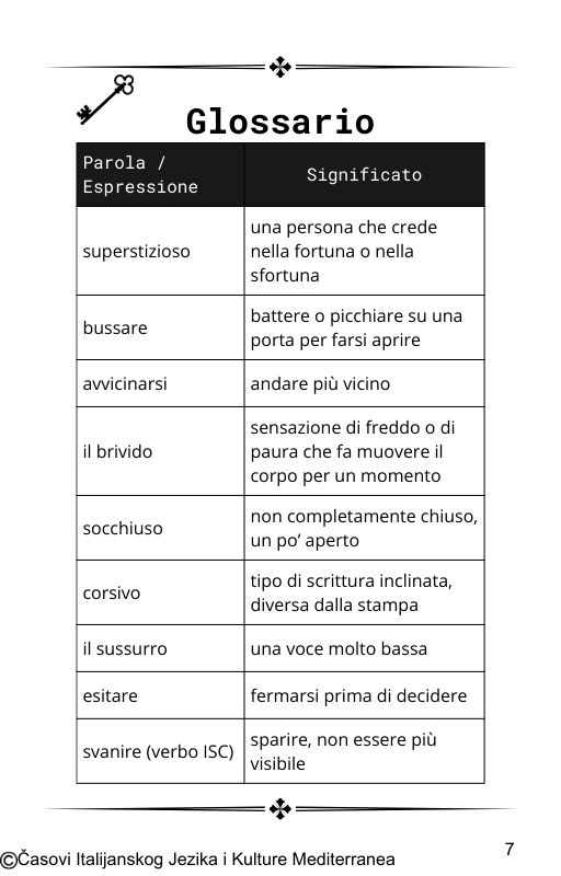 • Glossario (Rečnik): objašnjenja ključnih reči i fraza na kraju svake priče – takođe na italijanskom, kako bi tvoj mozak ostao “uključen” na izvornom jeziku.